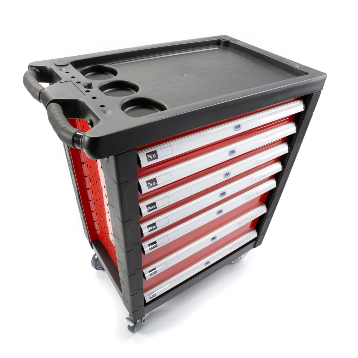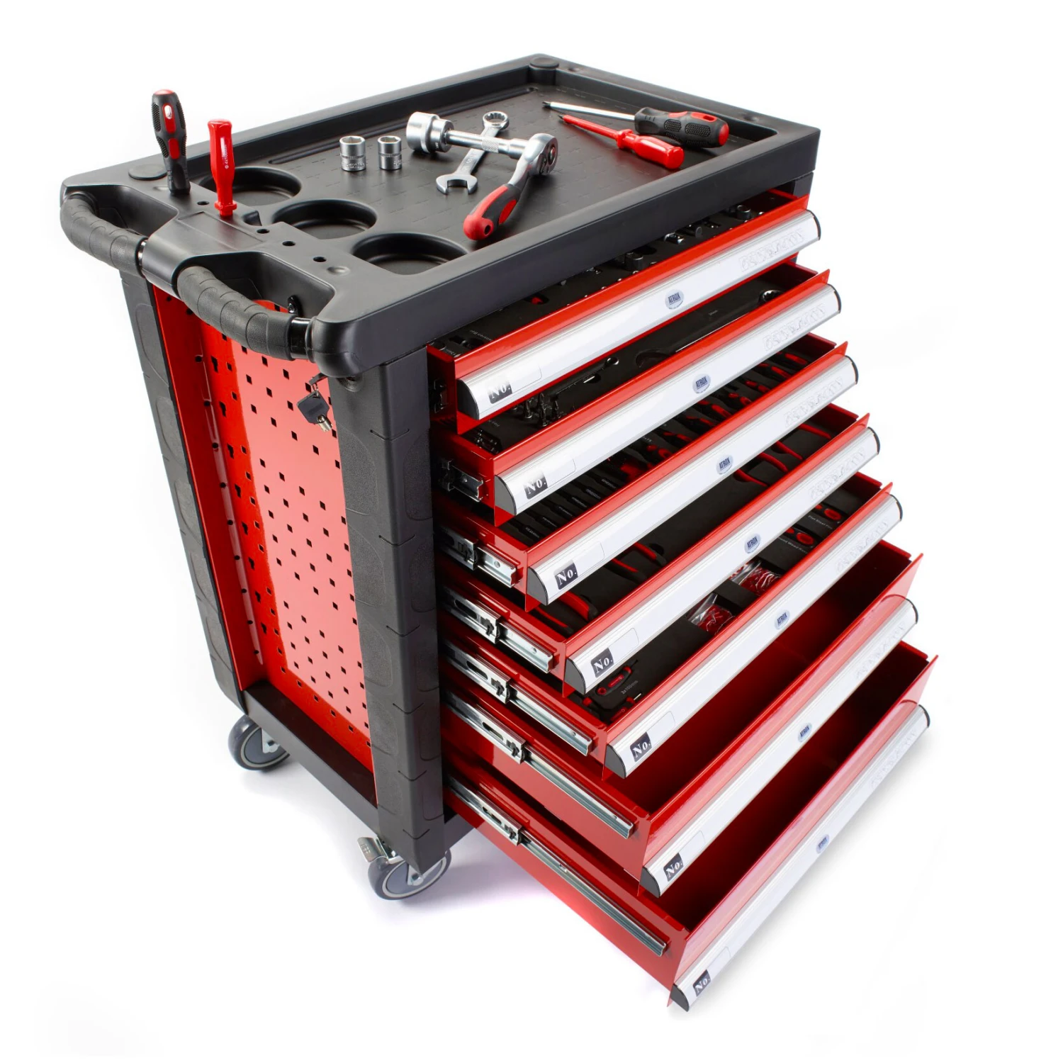 Große Auswahl an hochwertigen Werkzeugen, gefertigt aus robustem Karbonstahl. Im praktischen Kofferwagen für sichere Aufbewahrung, effektive Organisierung und Ordnung in Ihrer Werkstatt.