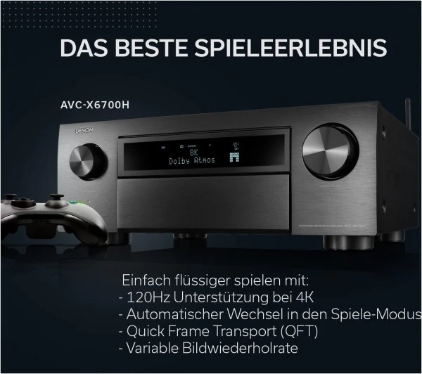 Mit den neuesten Verbesserungen im HDMI-Standard bringt der neue AVC-X6700H Ihre Games auf das nächste Level. Genießen Sie Games mit 4K/120Hz-Pass-Through und Upscaling sowie Variable Refresh Rate (VRR), Quick Frame Transport (QFT) und Auto Low Latency Mode (ALLM). Damit werden Verzögerungen, Ruckeln und Brüche im Bild reduziert oder eliminiert, um ein flüssigeres, natürlicheres und bewegungsscharfes Spielerlebnis sicherzustellen.