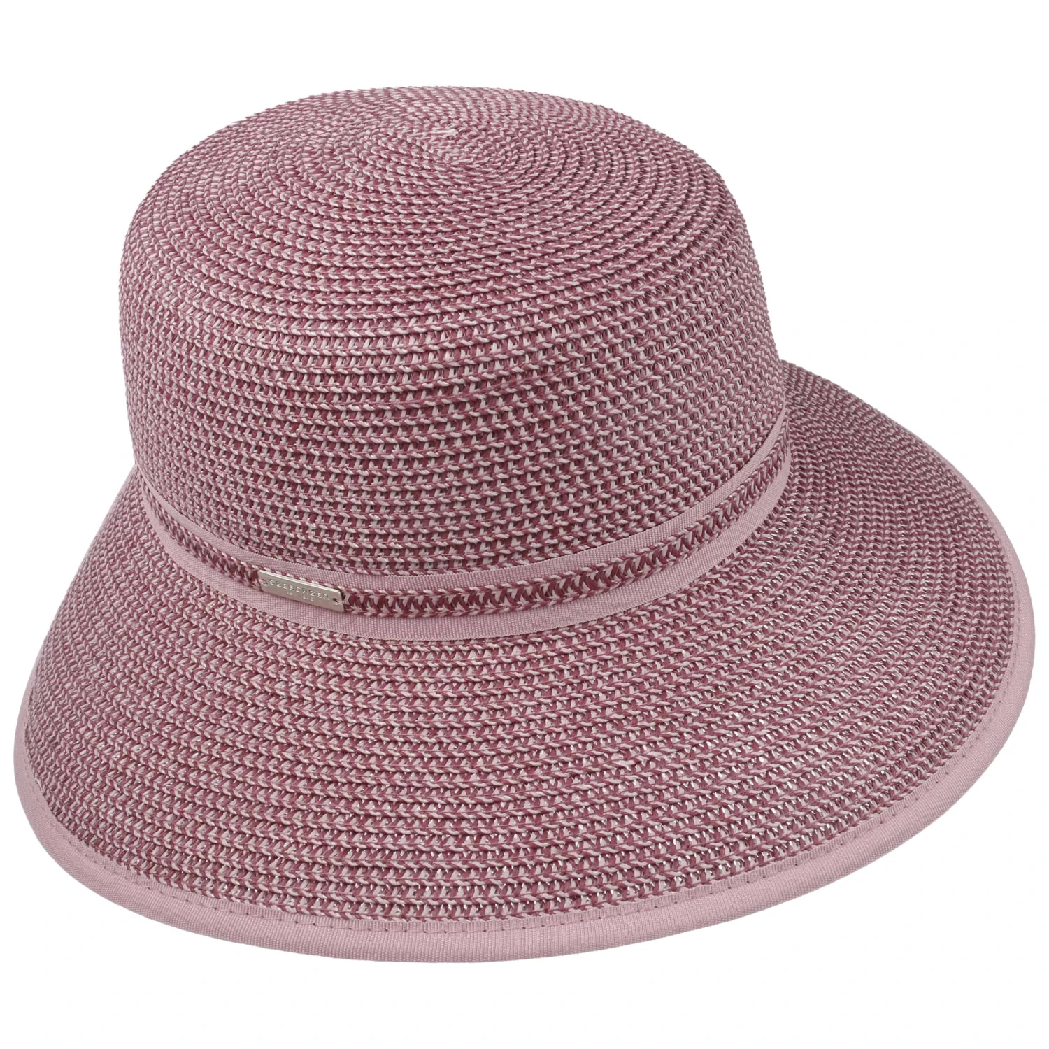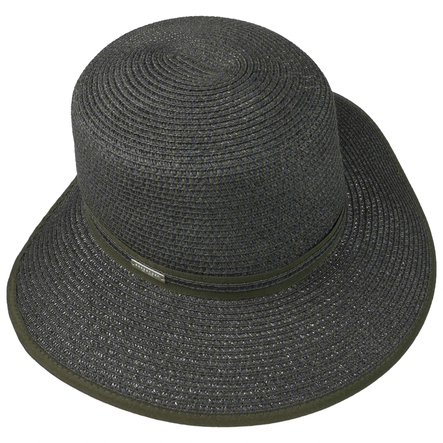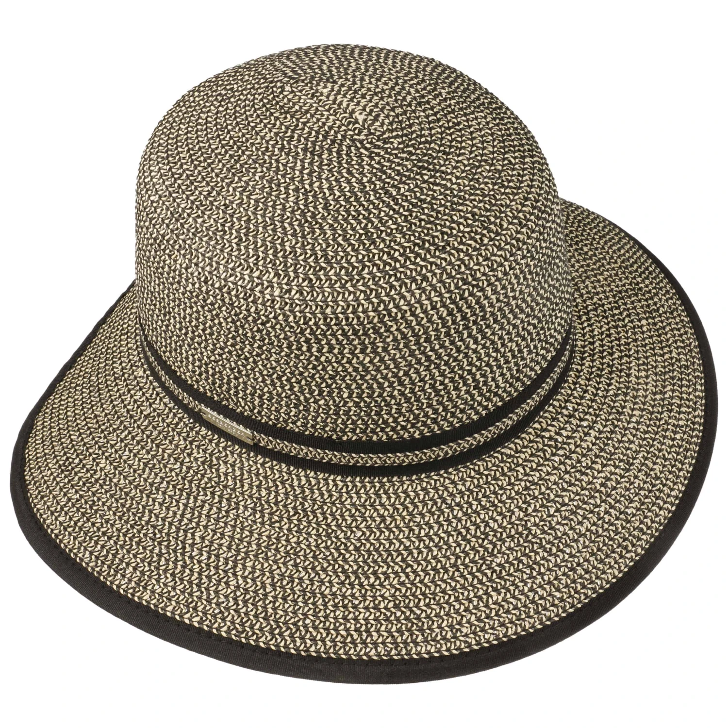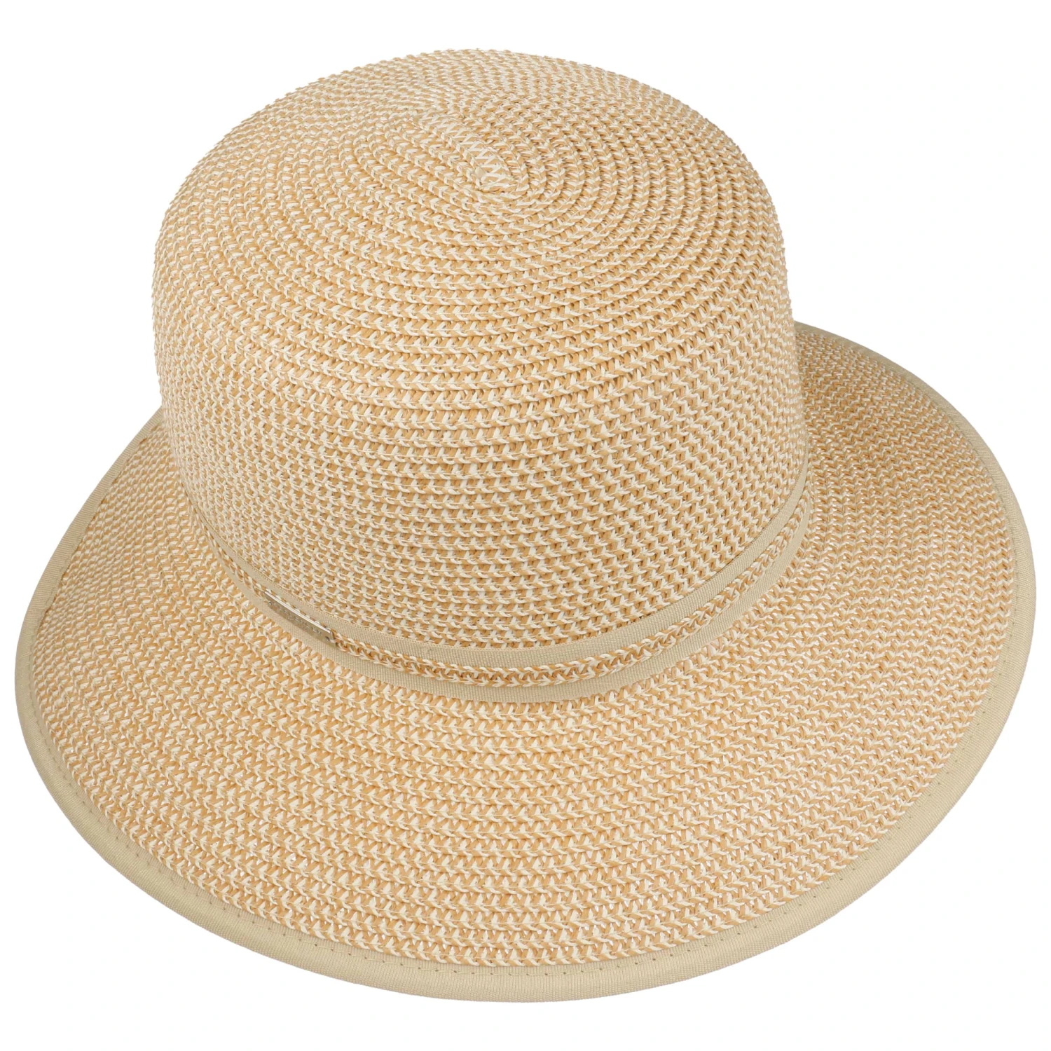 Die breite Krempe hält blendende Sonnenstrahlen aus dem Gesicht. Eine kleine Aussparung am Hinterkopf verleiht dem Sommerhut einen leichten Schutencharakter. Zwei dezente Garniturbänder und ein Paspeleinfass harmonieren wunderbar mit der melierten Farbgebung. Ein hoher Anteil Papierstroh sorgt für ultraleichten und luftigen Tragekomfort.