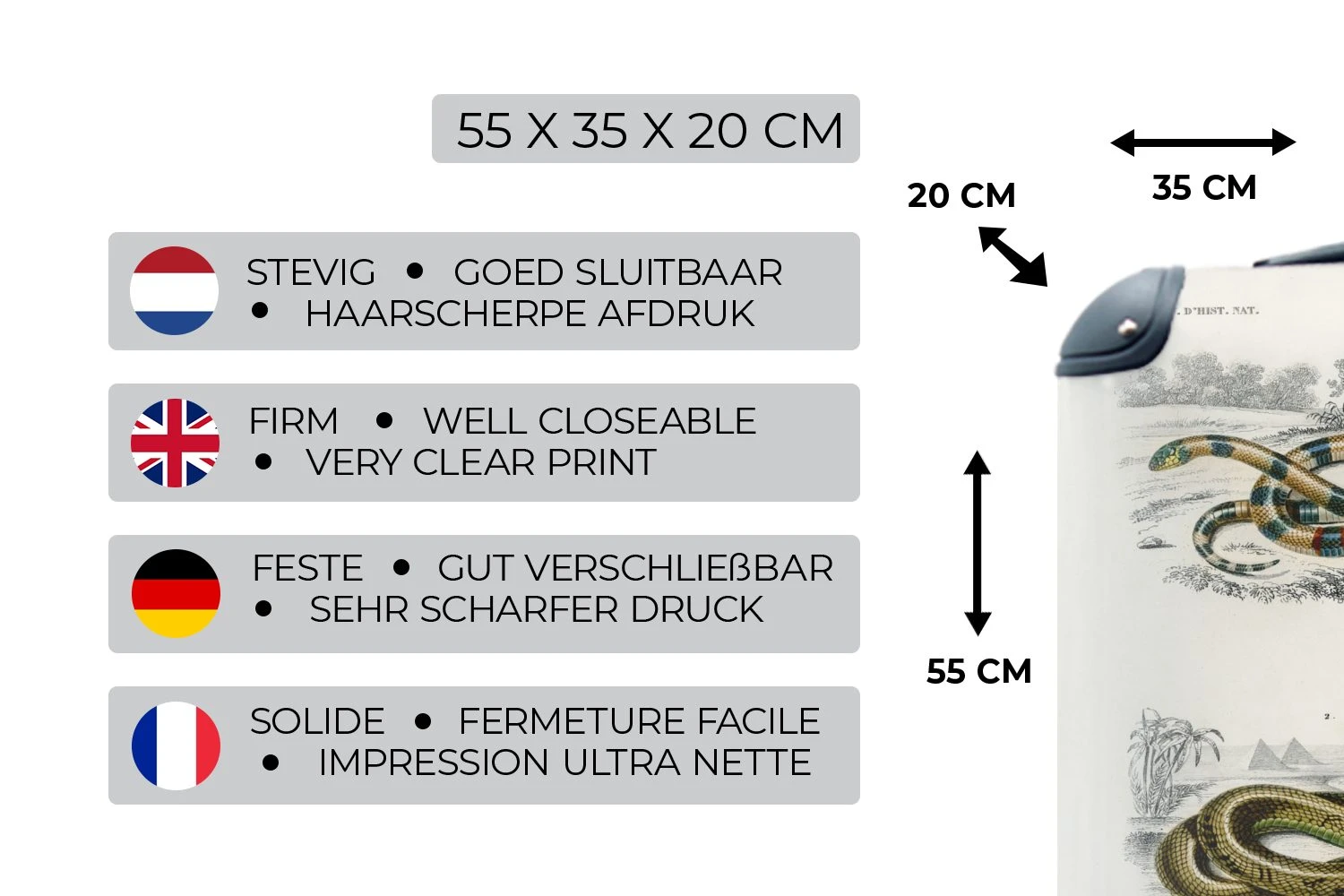 Das robuste Gehäuse des Hartschalenkoffers überzeugt durch einen UV-beständigen Druck in brillanter Farbqualität auf der Vorderseite. Die gerippte Struktur auf der Rückseite gibt dem Koffer mehr Stabilität und eine verbesserte Strapazierfähigkeit. Die moderne Hochglanzoberfläche besteht aus hochwertigem ABS-Material mit einer kratzfesten Beschichtung aus Polycarbonat und sorgt so dafür, dass Du noch viele Urlaubsziele mit Deinem neuen Lieblingskoffer bereisen kannst. Dank der vier wendigen Rollen und dem verstellbaren Teleskopgriff ist dieser Trolley ein solider und komfortabler Begleiter für jede Reisesituation. Das integrierte Zahlenschloss ist einfach zu bedienen und bietet dennoch zuverlässigen Schutz für Deine persönlichen Habseligkeiten.