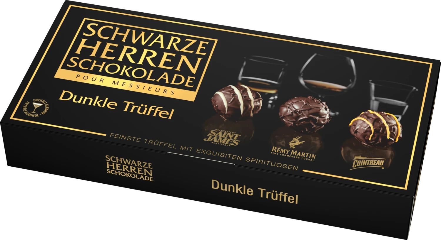 Raffiniert kombiniert. Schwarze Herren Schokolade Dunkle Trüffel ist die ausgewogene Allianz aus erlesenen Spirituosen und zartherber Edel-Bitterschokolade. Beißen Sie in die knackige Hülle der dekorativen Pralinen und entdecken Sie die cremigen Trüffel-Füllungen mit vollmundigem Saint James Rum, weichem Remy Martin Cognac und fruchtigem Cointreau. Dieser Komposition können auch Damen nicht widerstehen.