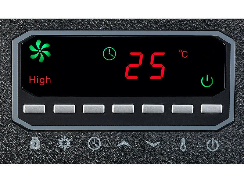 - LED-Display an der Vorderseite zur Anzeige der aktuellen Raumtemperatur, Zieltemperatur, Timer-Einstellung und des Betriebsmodus