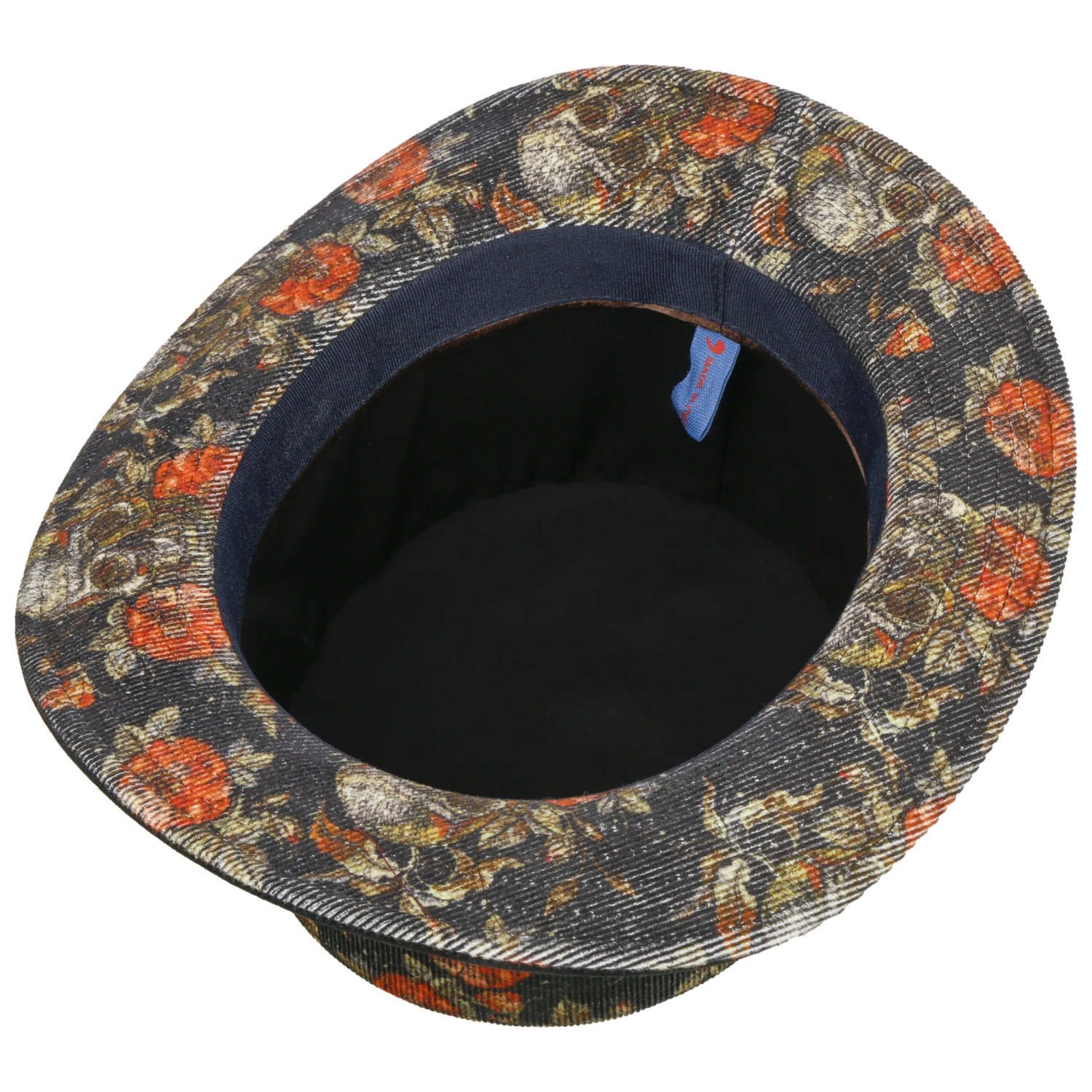 Ein Muster aus Blumen und Totenköpfen, kombiniert mit einer zweifarbigen Ripsbandschleife, verleiht dem Steampunk-Zylinder von Alfonso D´Este einen außergewöhnlichen Look.
