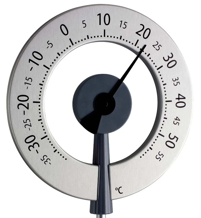 Das Thermometer überzeugt durch seine imposante Gesamt-Größe von 1 Meter und seiner edlen Optik. Es besteht aus einem 24 cm durchmessenden, runden Kopf mit einer Skala aus eloxiertem Aluminium. Darin befindet sich eine genaue Power Coil Bimetall-Feder, die die Temperatur über den großen Zeiger darstellt. Der Thermometer benötigt keine Stromversorgung und ist wetterfest. Eine Stange aus eloxiertem Aluminium (vierteilig, geschraubt) ist im Lieferumfang enthalten. So können sie den Lollipop einfach in den Boden stecken.