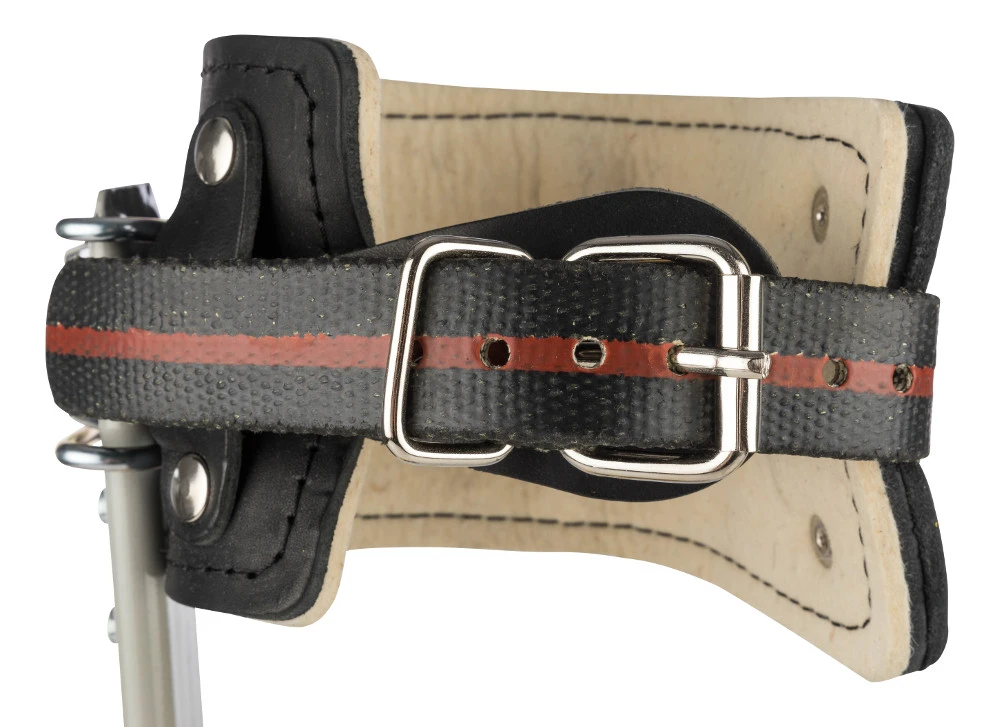 Steigeisen aus Aluminium mit weichem höhenverstellbarem Wadenpolster aus Leder und Filz sowie austauschbaren Dornen aus gehärtetem Stahl. Die verstellbaren Befestigungsriemen sind wasserdicht beschichtet. Das Baumsteigeisen wurde speziell für den professionellen und gewerblichen Einsatz im Bereich Forst und Baumpflege konzipiert. Die höhenverstellbaren Wadenpolster sind über ein Gelenk mit dem Bügel verbunden und verhindern Druckstellen an den Beinen. Die Form wurde dem menschlichen Bein angepasst, somit sind auch längere Einsätze kein Problem. Mit 2 kurzen Dornen und 2 langen Dornen, die sich je nach Einsatzzweck und Baumart einfach und schnell tauschen lassen.