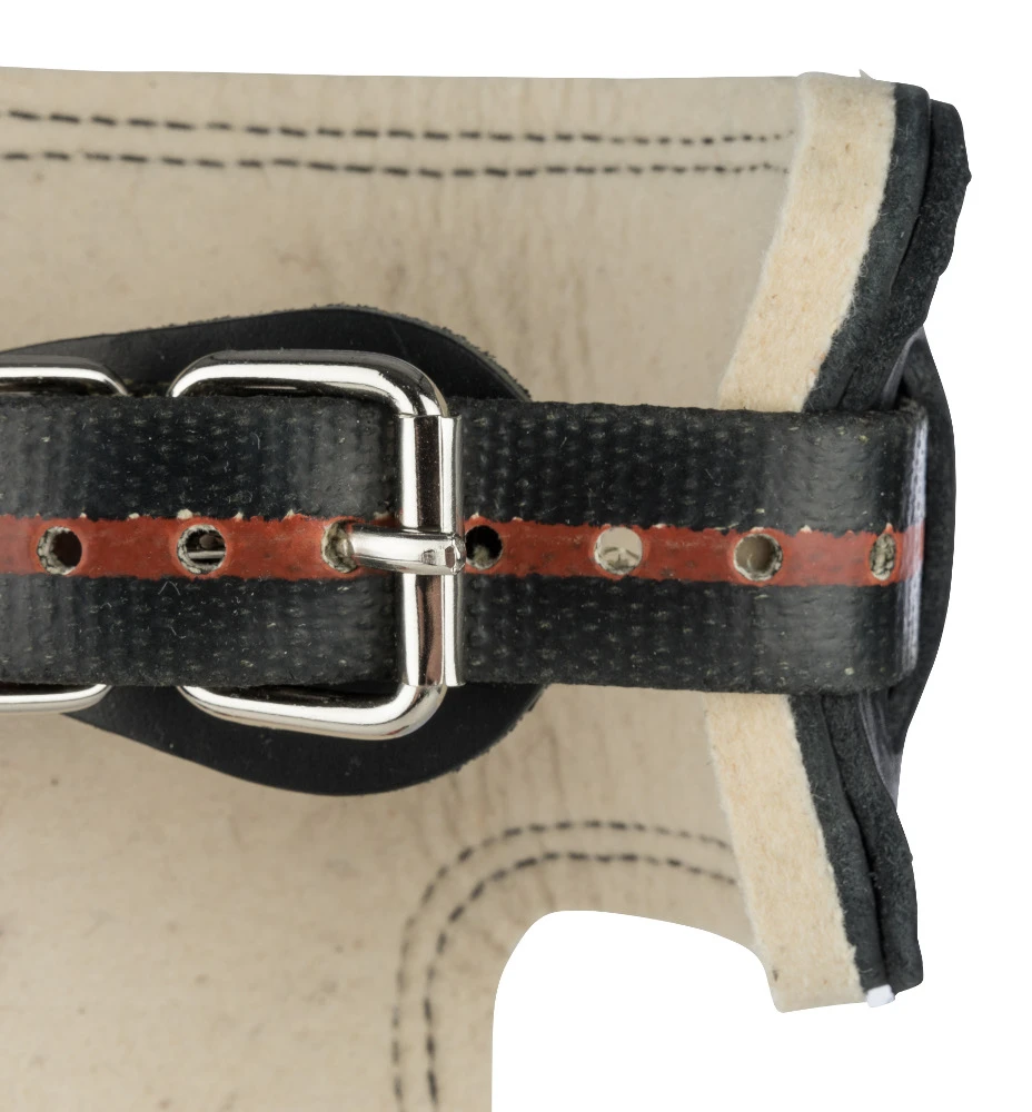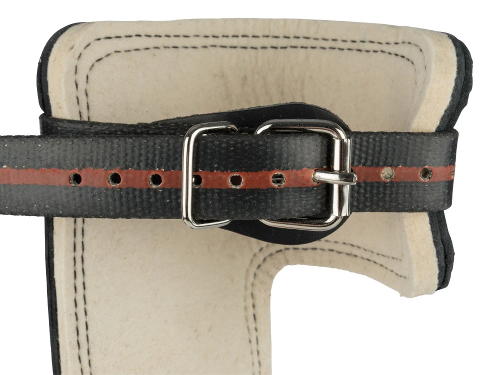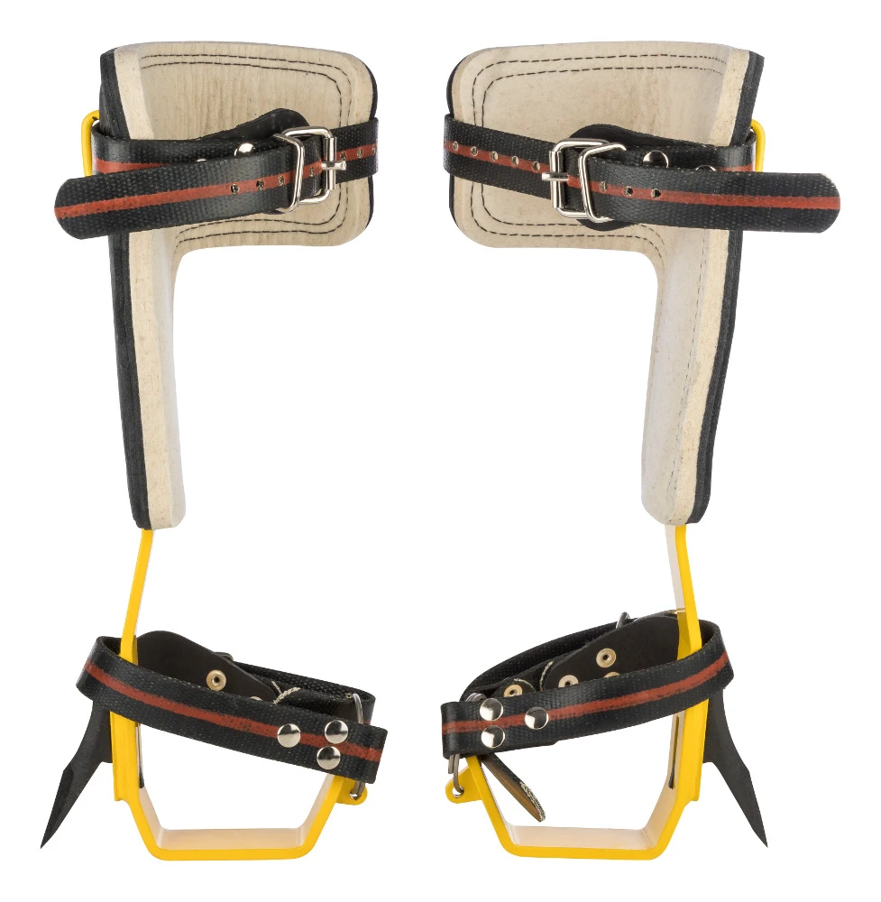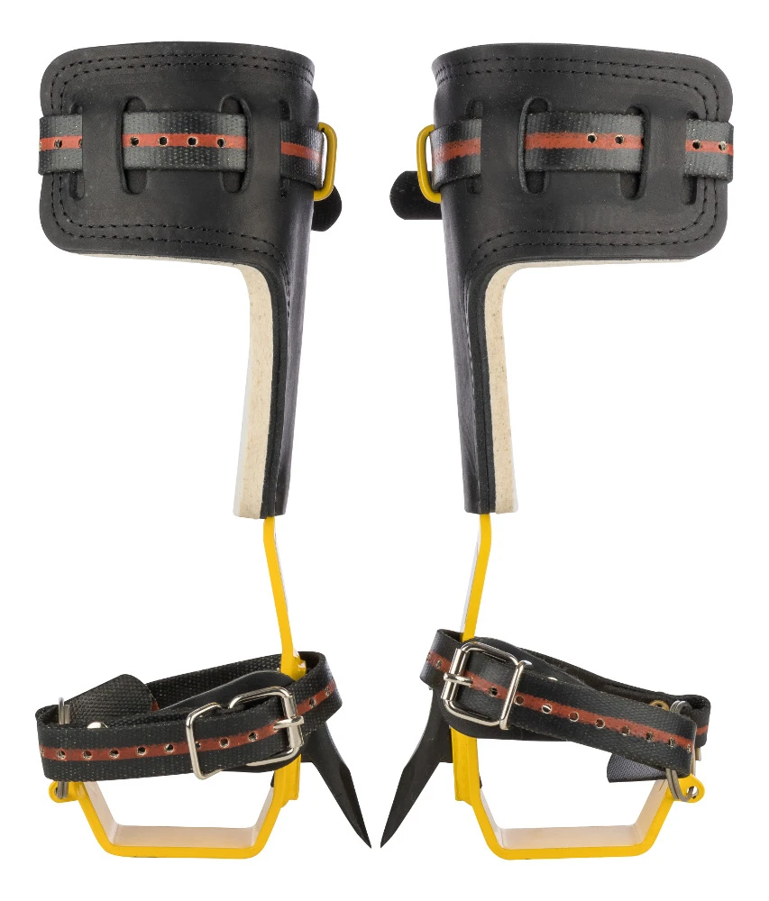 Stahlsteigeisen mit weichem langen Wadenpolster aus Leder und Filz sowie austauschbaren Dornen aus gehärtetem Stahl. Die verstellbaren Befestigungsriemen sind wasserdicht beschichtet. Das Metall ist pulverbeschichtet. Das Baumsteigeisen wurde speziell für den professionellen und gewerblichen Einsatz im Bereich Forst und Baumpflege konzipiert. Die Wadenpolster verhindern Druckstellen an den Beinen. Die Form wurde dem menschlichen Bein angepasst, somit sind auch längere Einsätze kein Problem. Mit 2 kurzen Dornen und 2 langen Dornen, die sich je nach Einsatzzweck und Baumart einfach und schnell tauschen lassen. Durch das geringe Gewicht von nur ca. 1,9 kg pro Steigeisen (Paar 3,75 kg), sind sie leicht zu handeln und belasten im Einsatz kaum.