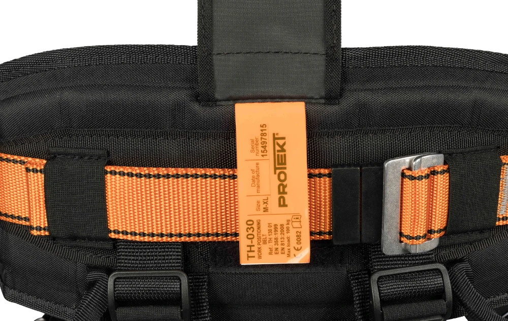 An der Seite befinden sich mehrere Befestigungsmöglichkeiten. Der Haltegurt TH 030 ist Bestandteil der persönlichen Schutzausrüstung für Haltefunktionen und zur Vermeidung von Stürzen bei der Arbeit an Bäumen, Masten und andere Anlagen.