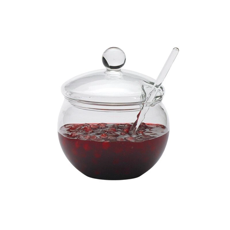 Ein besonderes Accessoire für den Frühstückstisch – die stilvolle Marmeladendose aus Glas von Trendglas Jena. Das schöne Modell wird inklusive Deckel und kleinem Glasurrührstäbchen geliefert.