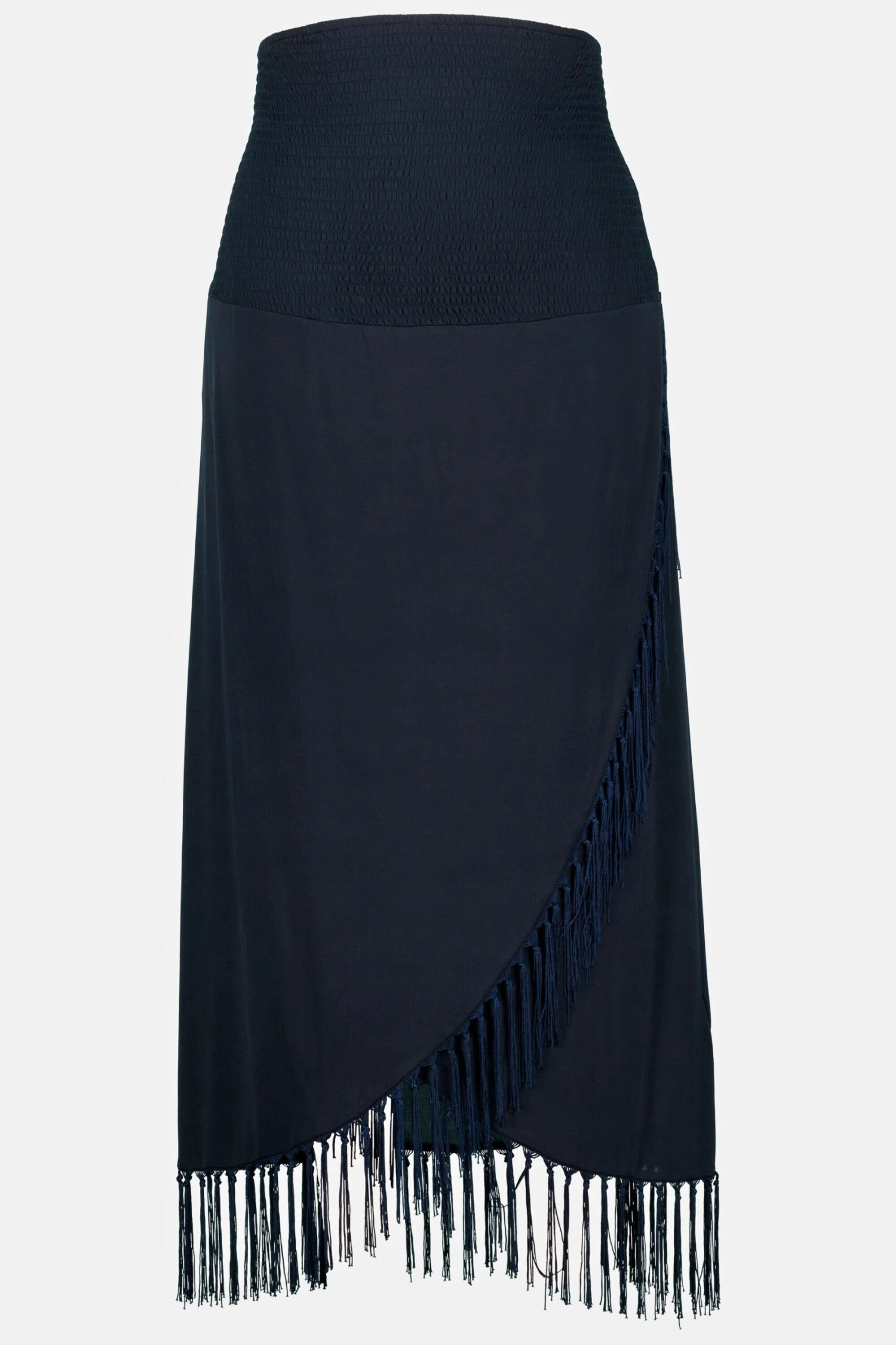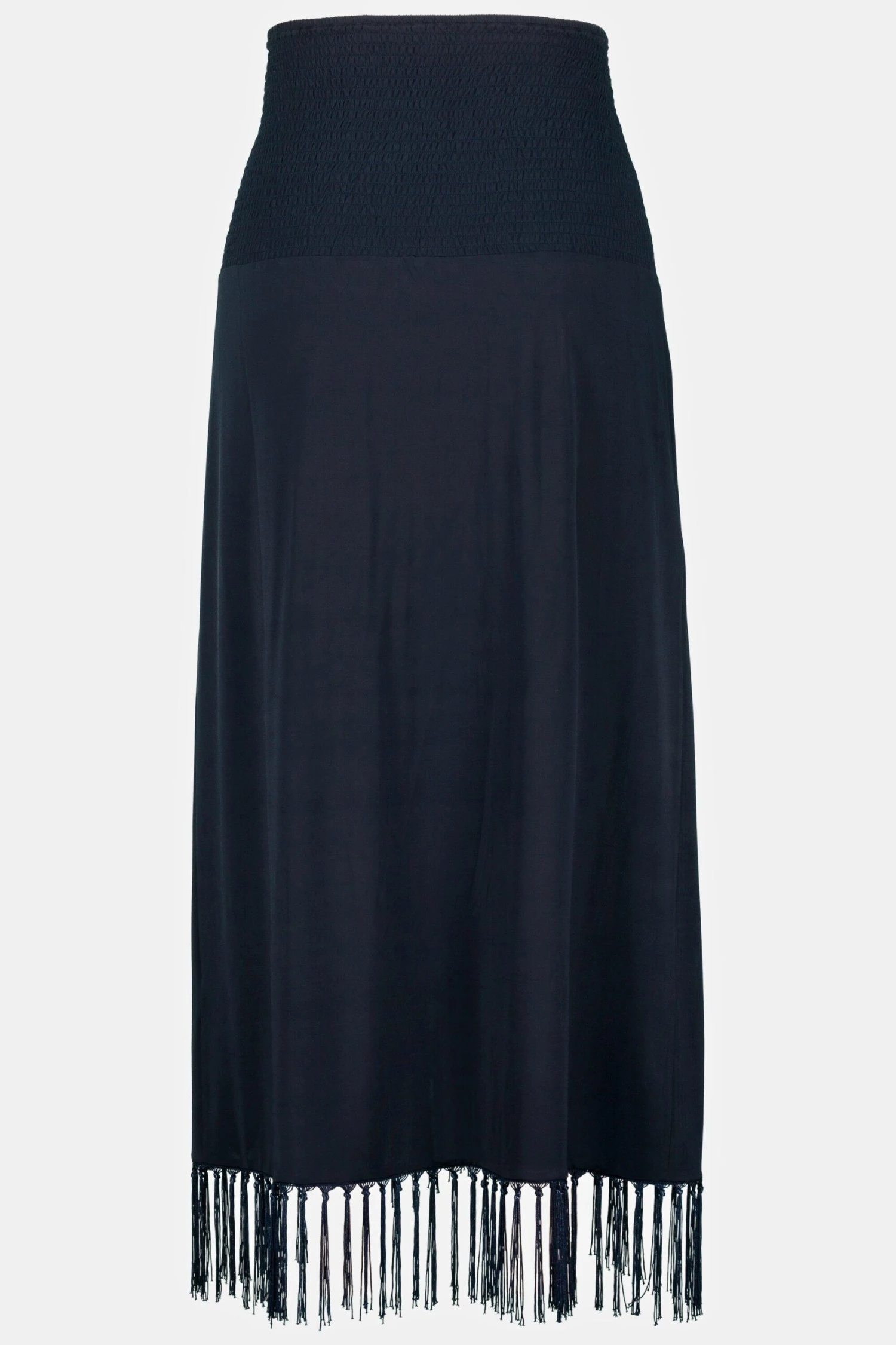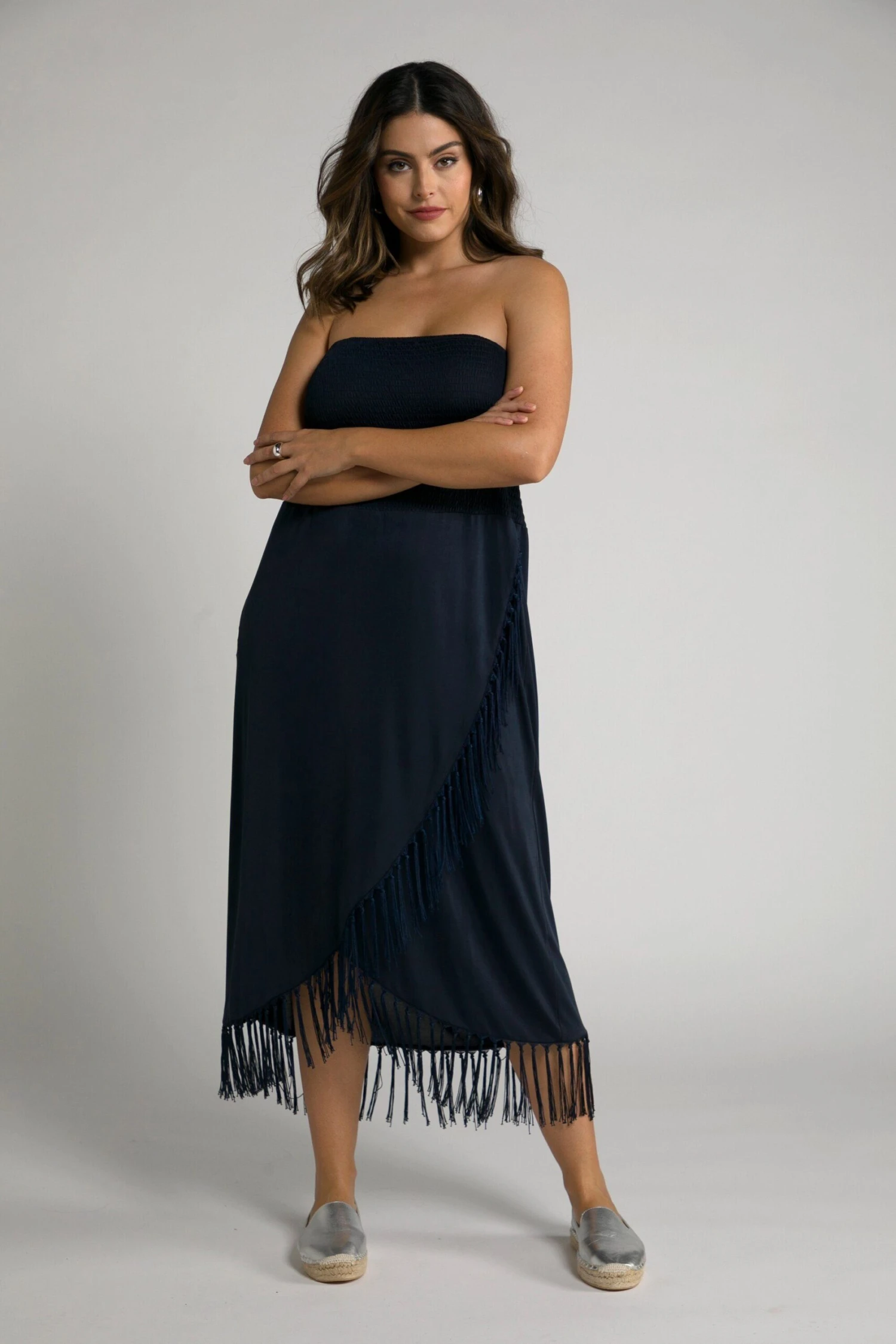 Bandeau-Kleid mit elastisch gesmokter Büste, trägerlos. Saum in Wickel Optik mit Fransen Kanten.